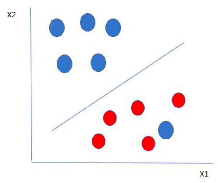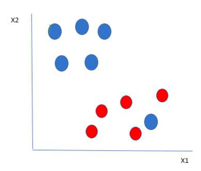 Suppose there are two independent variables, x1 and x2, and one dependent variable as either a blue or a red circle.